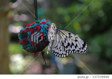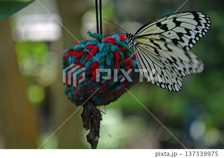 熱帯温室のカラフルな吸蜜台に羽を休める白黒模様のオオゴマダラ