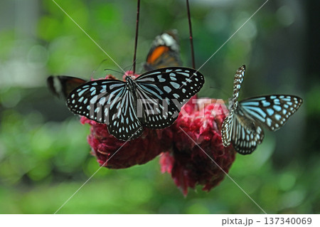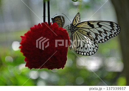 熱帯温室の赤い吸蜜台に集まり羽を休める大型のオオゴマダラ