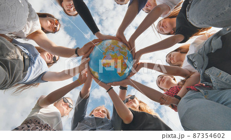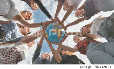 Earth conservation concept. 11 girls hug the earth globe with their hands.