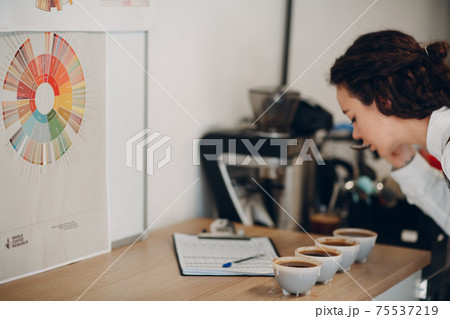 Cup Taster Girl Tasting Degustation Coffee Quality Test. Coffee Samples and Chart Cupping