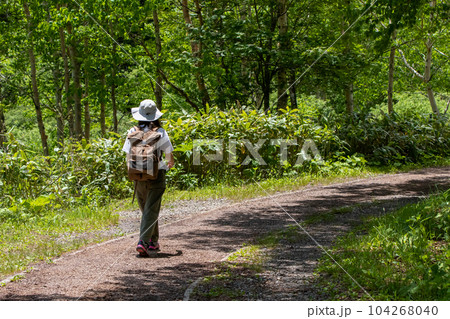 野反湖畔の遊歩道を歩く女性