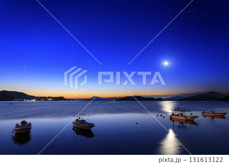 瀬戸内の冬の星景色 薄明の空に昇る月と残る星明かり