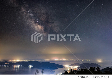 瀬戸内の星景 港町の夜景と薄明の空の星の軌跡