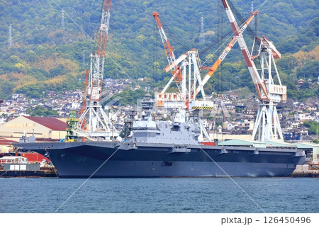 【広島県】晴天の海上自衛隊 呉基地に停泊する大型護衛艦 かが