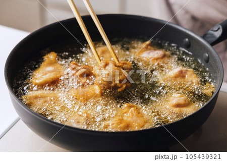 フライパンで揚げている鶏肉の唐揚げ