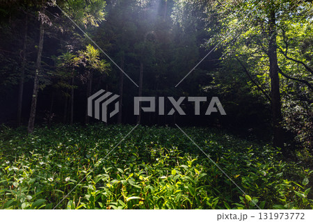 新緑の森に流れる小川