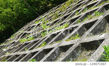 静岡県周智郡森町の風景(かわせみ湖に整備された格子状擁壁)
