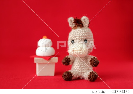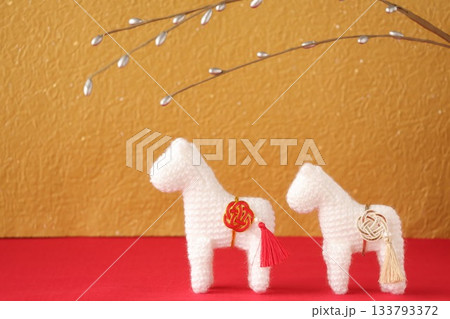 水引きの飾りをつけた二頭のうまのあみぐるみ