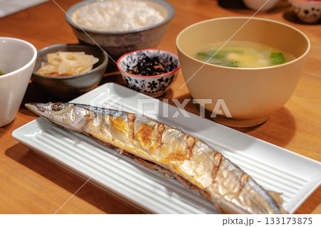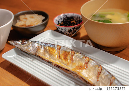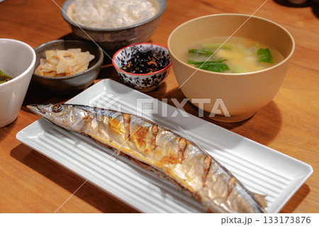 焼きさんまと味噌汁、れんこんや黒豆を添えた和風の夕食