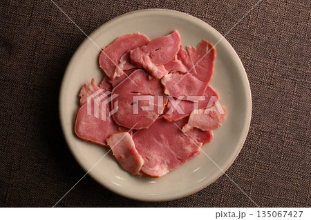 煮卵と鶏ハム、かぼちゃの煮物や納豆を添えた和風の朝食プレート