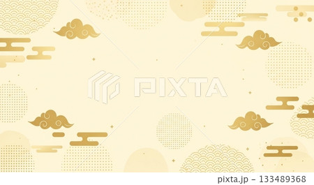 金色の雲と和文様が柔らかく散りばめられた、上品で淡い色合いの和風背景デザイン