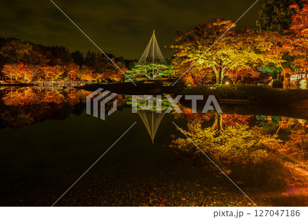 タイトル(日本語) 紅葉と池に映る橋のライトアップ タイトル(英語) Autumn Bridge R