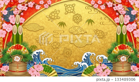 金色を基調に門松や松竹梅が並ぶ華やかなお正月和風背景