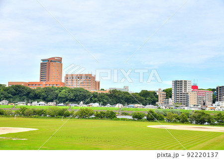 江戸川グラウンド越しに和洋女子大学~市川駅方面を望む(千葉県市川市)【2022.7】