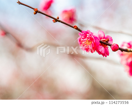 満開の梅の蜜を懸命に集めるかわいいミツバチ