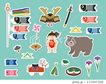 日本の伝統文化の手描きイラストステッカーセット 風習、歴史、食、建築、行事のベクター素材