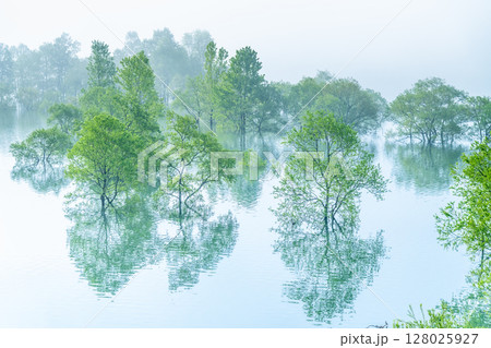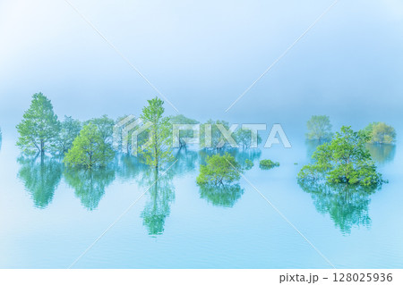 北上線 朝靄の中、錦秋湖の水没林を行くキハ100