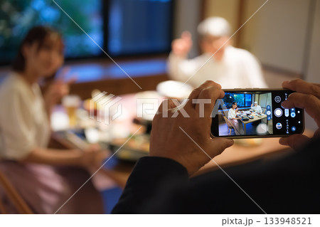 旅館の夕食で親子三人が撮り合いながら楽しむ思い出づくりの時間