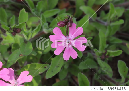 春の日本の公園に咲くピンク色のフクロナデシコ(サクラマンテマ)の花