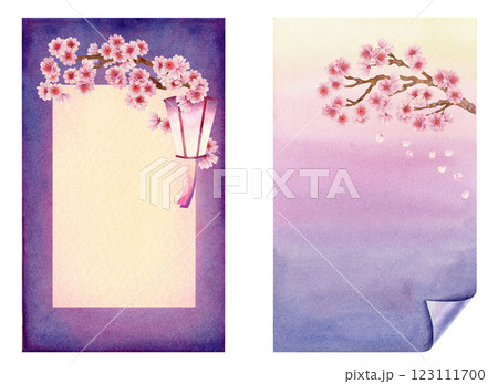 Vertical frames with blooming sakura flowers with gradient background in pastel pink, lilac, purple colors for Hanami festival Two spring watercolor templates for postcard, poster, postcard, wedding