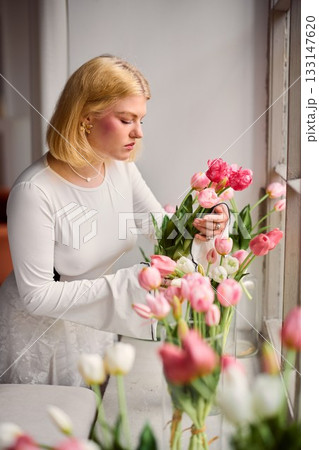 Woman organizes tulips for heartfelt gift in her cozy home
