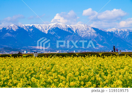 滋賀県守山市のなぎさ公園に広がる菜の花畑と雪の残る比良山