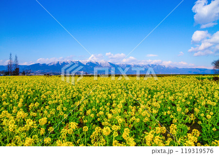 早咲きの菜の花と雪山