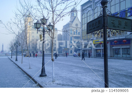 中国黒竜江省ハルビン・中央大街の冬の朝 / Zhongyang St., Harbin, China