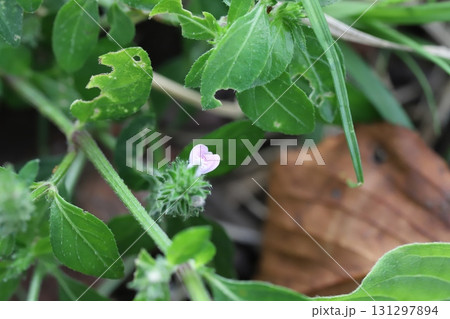 冬の道端に咲くピンク色の小さなホトケノザの花
