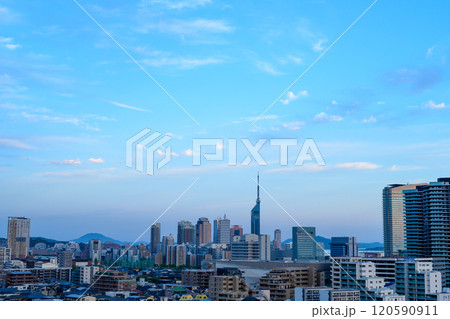 唐人町・大濠公園方面からの早良区百道浜、地行浜、福岡タワー 快晴な空の夕暮れ 青空シルエット深影明