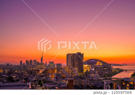 唐人町・大濠公園方面からの早良区百道浜、地行浜、福岡タワー 快晴な空の夕暮れ 夜景橙色