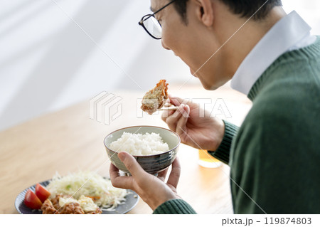 食卓で食事をするアラフォーの男性