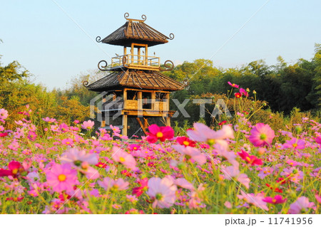 コスモスと唐古遺跡楼閣