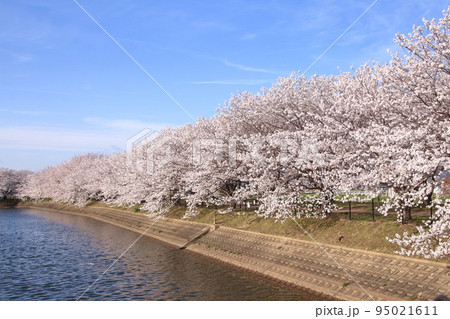 奈良の弥生遺跡 唐古・鍵遺跡の唐古池に咲く満開の桜並木と花筏