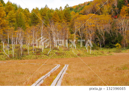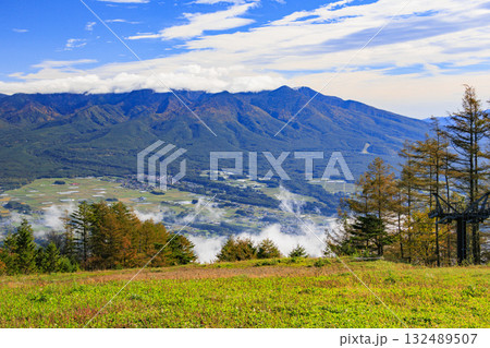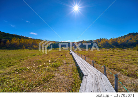 秋の長野県東御市の池の平湿原の木道から南西側の眺望(カラマツ黄葉,鏡池方面)
