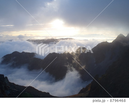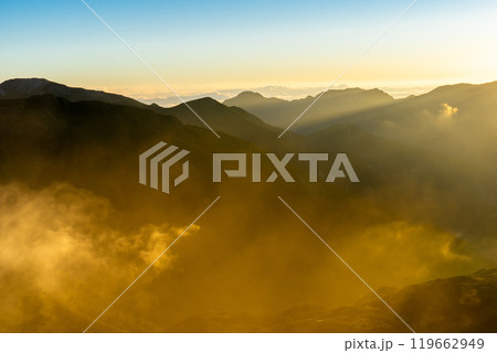 モルゲンロートの南真砂岳と唐沢岳 北アルプスの双六岳の登山