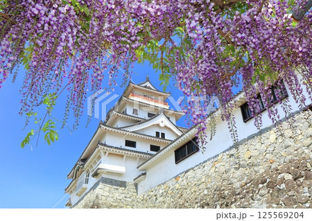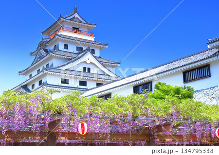 【佐賀県】晴天の唐津城天守閣と満開の藤棚