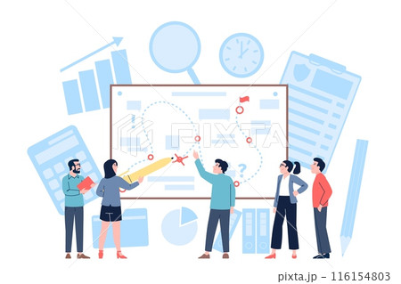 Strategic planning. Business team plan working process on whiteboard. Mistakes and right steps tactic corporate development, recent vector scene