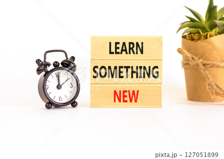 Learn something new symbol. Concept words Learn something new on beautiful block. Black alarm clock. Beautiful white background Business motivational lifestyle learn something new concept Copy space