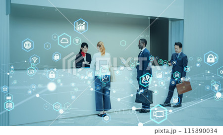 受付に並ぶ多国籍の人々とビジネスネットワーク