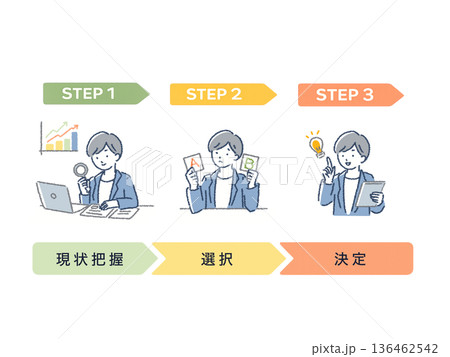 現状把握・選択・決定の流れを示す3ステップ図解イラスト