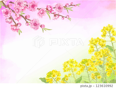 水彩で描いた桃の花と菜の花のベクターイラスト