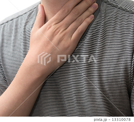 喉を押さえる若い男性 白バック