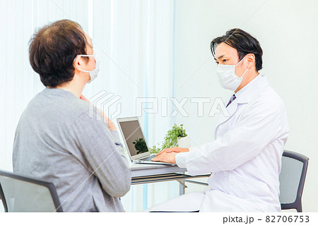 パソコンで診察するマスク姿の男性医師(のど)