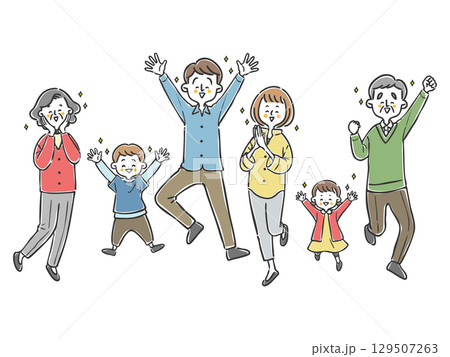 喜んでいる家族三世帯 全身 ベクター(モノクロ)