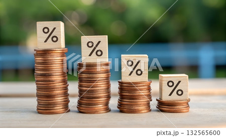 Declining interest rates shown with stacks of coins and percentage blocks outdoors