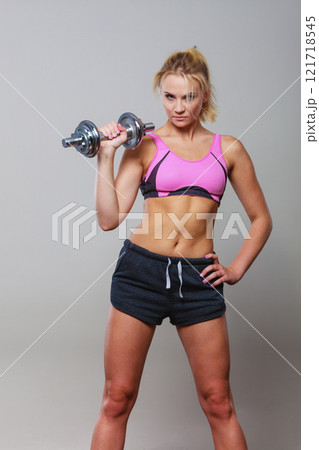 Closeup hand of young woman lifting dumbbell and showing smartphone isolated.