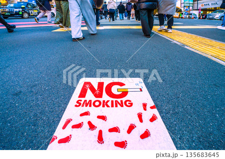 日本の東京都市景観渋谷・宮益坂下交差点前に「路上・公園等 喫煙禁止」表示。高齢者の路上喫煙が増加…