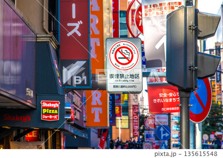 日本の東京都市景観渋谷・宮益坂下交差点前に「路上・公園等 喫煙禁止」表示。高齢者の路上喫煙が増加…