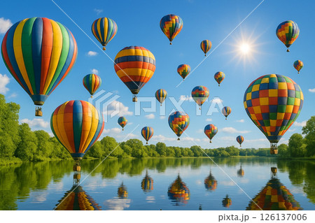 青空に沢山の熱気球と水面に映える景観